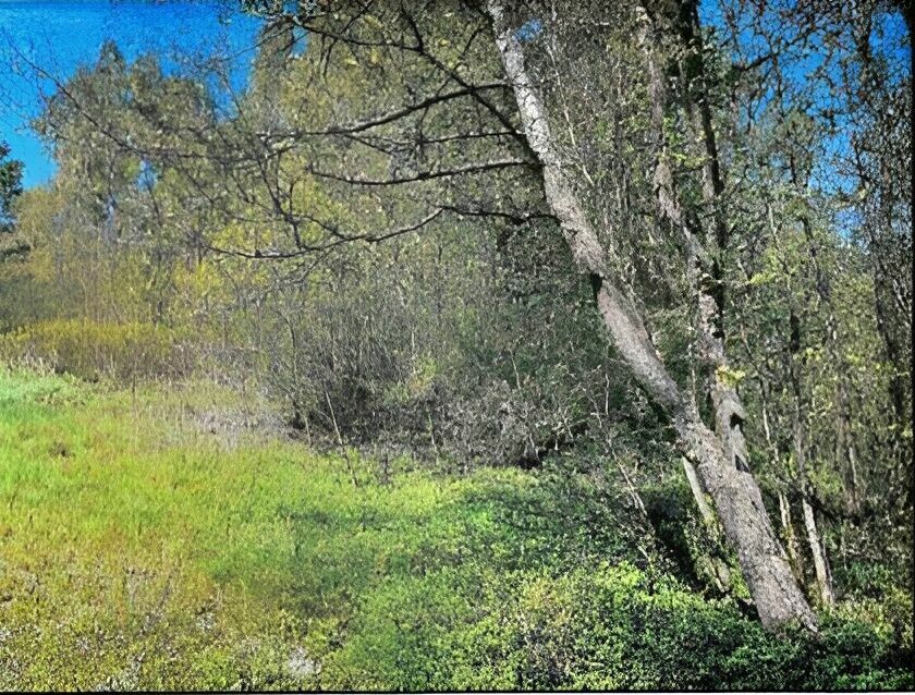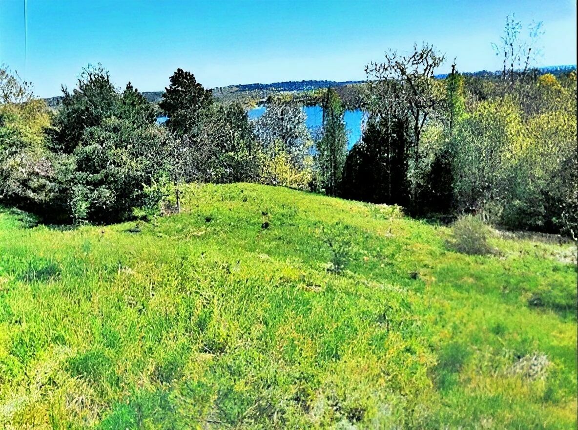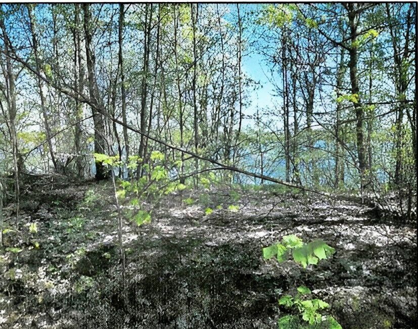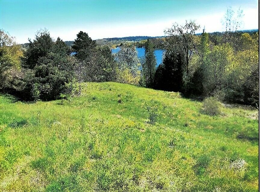 Ukształtowanie terenu: Wyniesienie morenowe (skarpa) z widokiem na jezioro i okolicę. Teren urozmaicony, częściowo porośnięty trawą, z skupiskami drzew i krzewów.